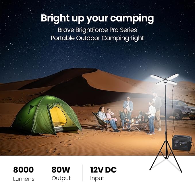این محصول با ارائه روشنایی فوقالعاده ۸۰۰۰ لومن، پوشش فوقالعاده روشن و گستردهای را فراهم میکند که برای کمپها، محلهای کار، سفرهای شکار یا موقعیتهای اضطراری که حداکثر دید بسیار مهم است، ایدهآل است. این چراغ دارای چهار پنل تاشو به سبک «پره فن» برای نگهداری جمع و جور و تنظیم جهت نور است. پایه سه پایه تلسکوپی محکم آن، ۳ تنظیم ارتفاع ارائه میدهد و تا حداکثر ارتفاع ۲.۵ متر (۲۵۰ سانتیمتر) امتداد مییابد و موقعیت پایداری را در زمین ناهموار فراهم میکند.