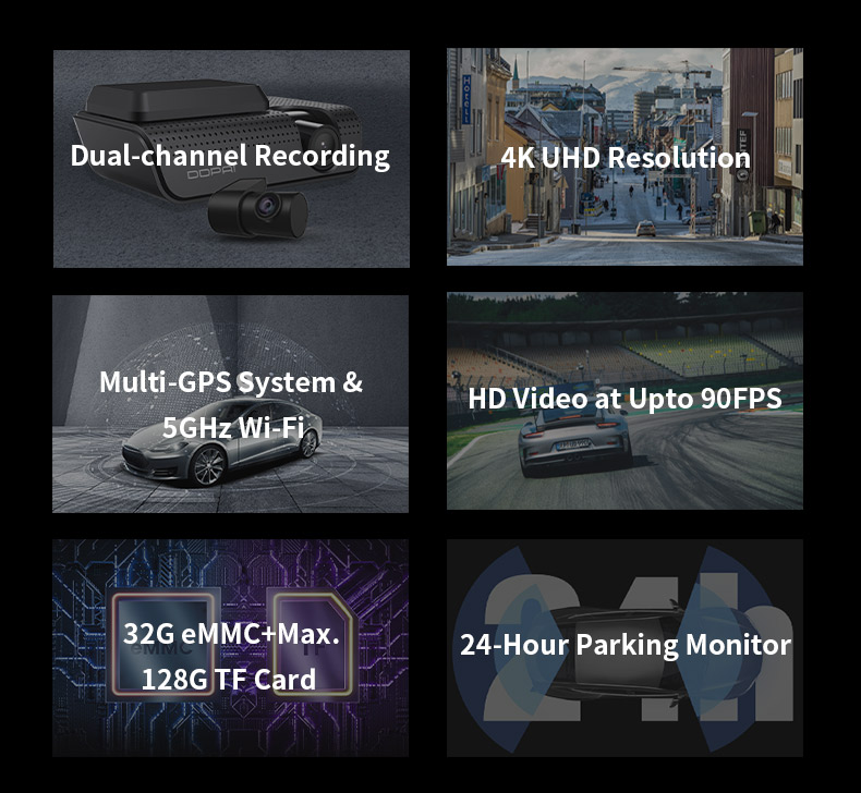 بعلاوه شما با کمک GPS، ژیروسکوپ 6 محوره و حسگر گرانش می توانید سفرهای خود را تحت کنترل داشته باشید. بعلاوه درهنگام پارک می توایند دو دوربین را فعال کرده و تا 24 ساعته از اتفاقات پیرامون ماشینتان با خبر شده و اگر ماشین شما به سرقت رفت از موقعیت آن با خبر شوید. بعلاوه این محصول تصادفات را تشخیص داده و قبل از تصادف به صورت خودکار آن را ثبت می کند و در پوشه ای جداگانه ذخیره و قفل می کند.