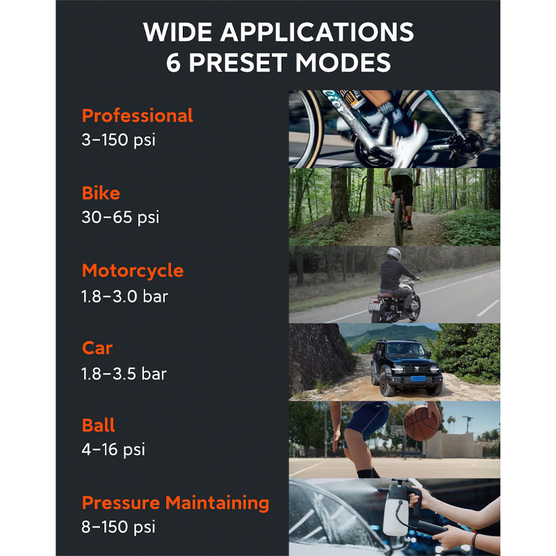 فقط کافی است حالت موردنظر را انتخاب کنید — پمپ به‌صورت هوشمند تا فشار تعیین‌شده باد می‌کند و سپس به‌طور خودکار خاموش می‌شود.
