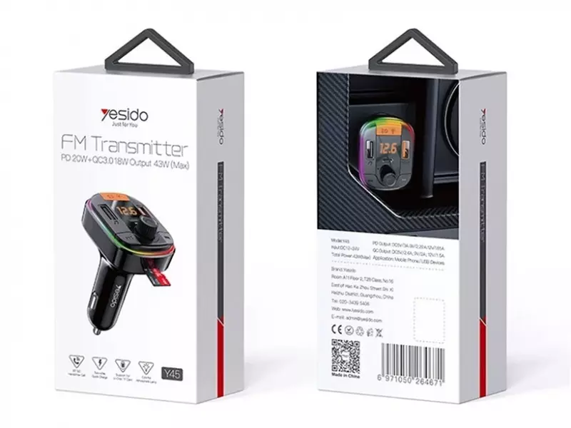 شارژر فندکی با قابلیت پخش موسیقی و تماس Yesido Y45 bluetooth V5.0 FM Transmitter 18W PD + QC3.0 Dual USB Car Charger